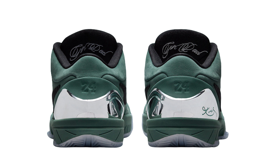 The Bicoastal green upper draws inspiration from Kobe’s beanie and pairs with premium materials and a chrome heel clip. Metallic Silver branding and an icy outsole add a touch of shine to the design. These thoughtful details combine to honour Kobe and Gigi, encouraging the celebration of girl dads.
