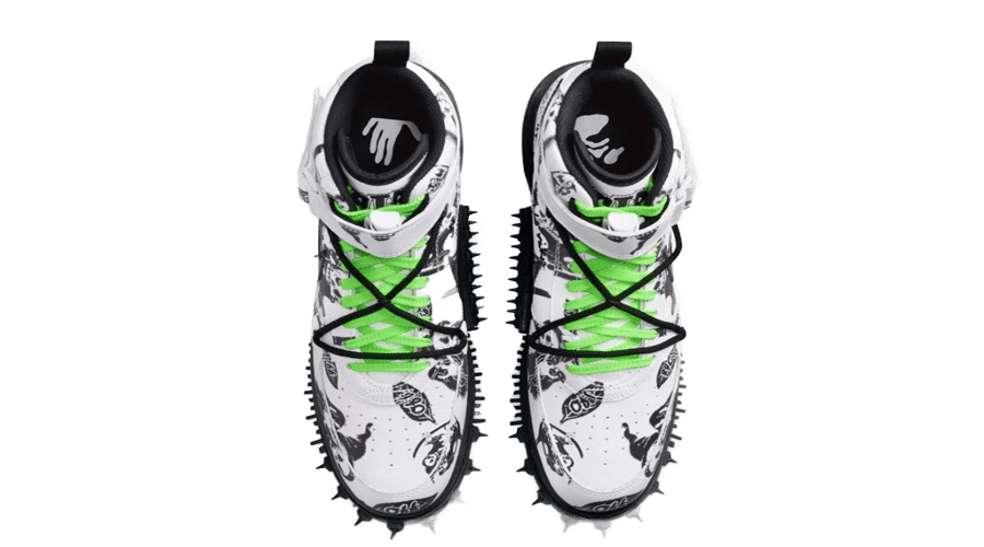 A sleek, black Swoosh graces the outer side, complementing the edgy spiked rubber sole that defines the silhouette. Vibrant lime green accents inject a burst of colour into the primary lace set, adding a touch of vibrancy to the monochrome aesthetic. As a signature Off-White touch, these trainers come adorned with a characteristic white hangtag.