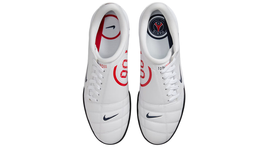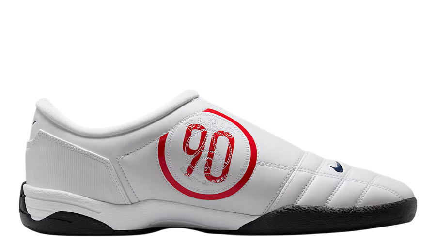 A clean white leather upper sets the stage, paired with a quilted forefoot panel that echoes the boot’s precision-driven origins. An oversized navy Swoosh sweeps across the lateral side, balanced by the deep red “90” emblem on the medial panel — a detail that now sits alongside the stitched PSG crest. These branding elements not only reference the model’s Y2K debut but also tie it directly to the French club’s identity.