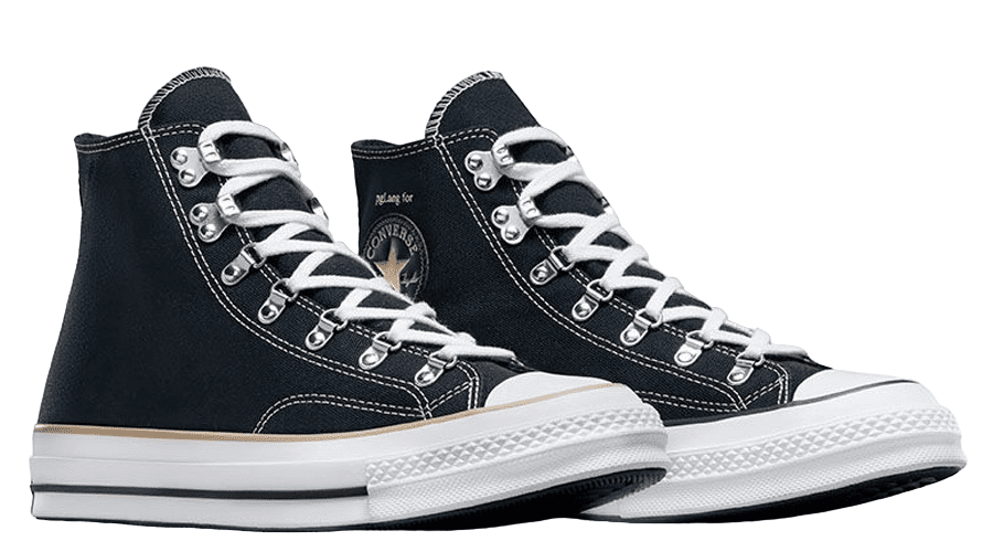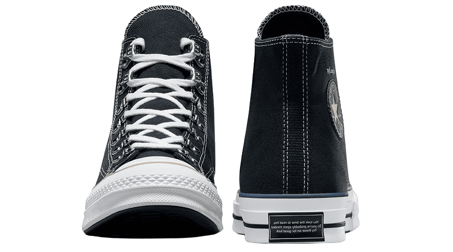 So, why should you consider these shoes? They are high-top sneakers with a classic black canvas upper and come in two distinct pinstripe color variations, ensuring a unique look. The addition of hiking eyelets adds both style and practicality to these sneakers. Furthermore, they feature an asymmetrical varnish application on the rubber foxing, a transparent Chuck Taylor ankle patch, custom toe cap mold details, a sockliner with a unique print, and a license plate showcasing a text graphic, making them a must-have for those who appreciate a blend of fashion and functionality in their footwear.