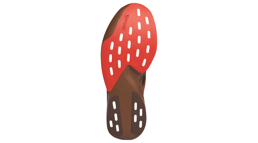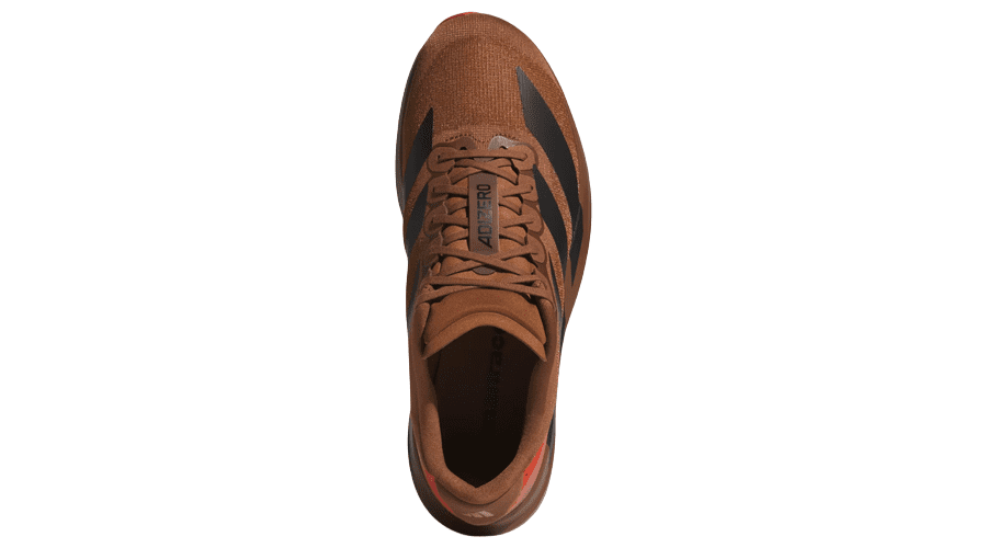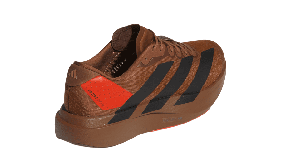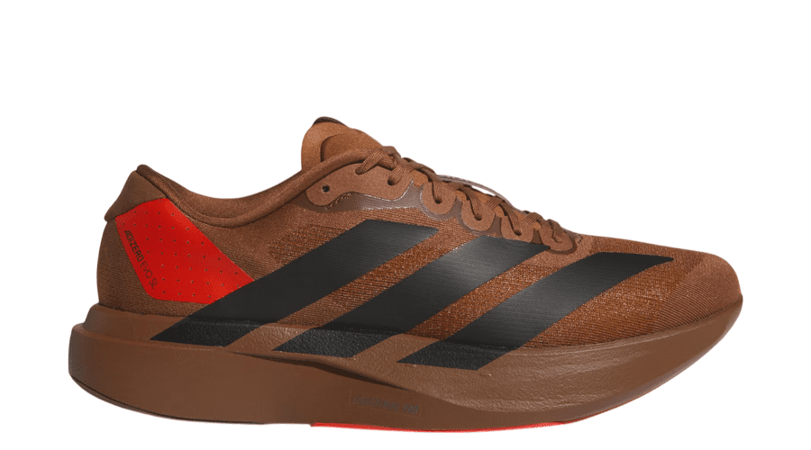 The colour palette sets the tone straight away. Preloved Brown covers most of the upper and midsole, creating a warm, seasonal look that stands apart from typical bright running shoes. Three black adidas stripes cut through the side panels for contrast, while a red accent at the heel wing and outsole adds a subtle pop of colour.