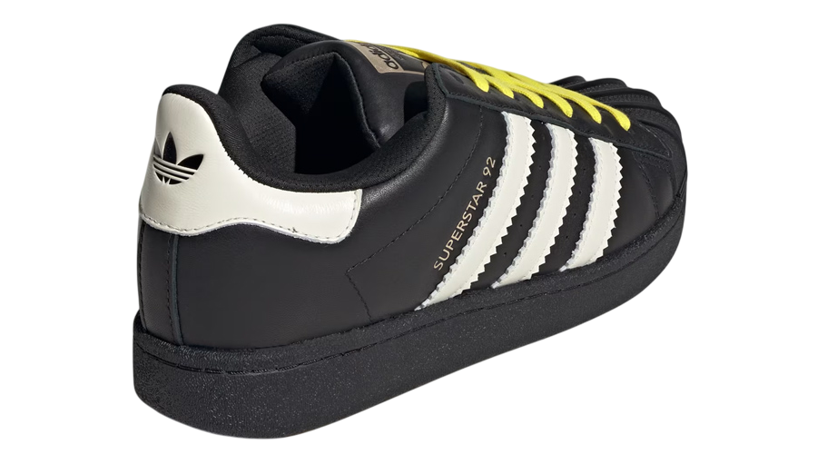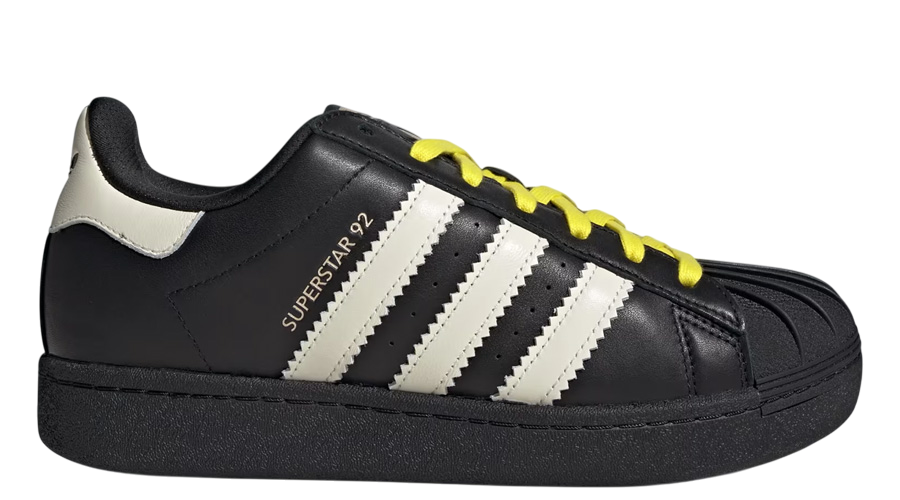 The all-black leather upper delivers a stealthy aesthetic, while the signature shell toe gets a bulky upgrade, providing extra protection and a rugged edge. Serrated 3-Stripes branding remains intact, maintaining the Superstar’s heritage feel. A Trefoil logo on the tongue and heel tab reinforces adidas’ classic design language, while “Superstar 92” lettering on the lateral side nods to the shoe’s vintage basketball roots.