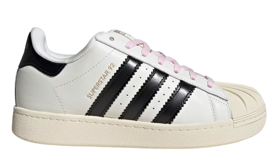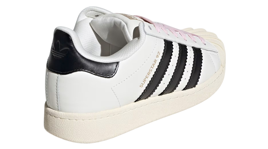 The white leather upper keeps things clean, while cream accents on the exaggerated shell toe and thick cupsole add a vintage touch. Black serrated 3-Stripes on the sidewalls pay homage to the OG Superstar design, paired with a “Superstar 92” label and classic Trefoil logos. Pharrell’s “Virginia” branding on the tongue gives a personal nod to his hometown, blending heritage with modern streetwear influences.