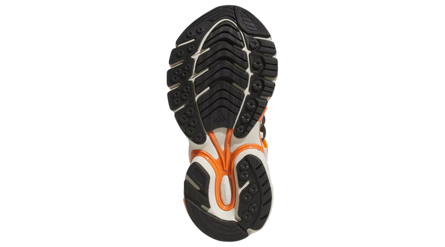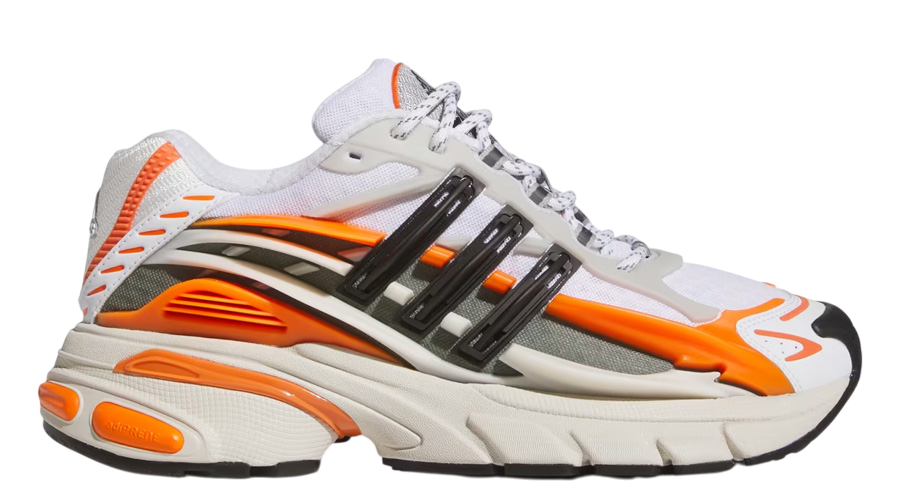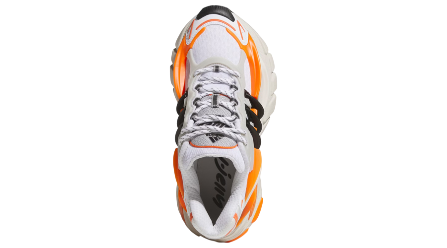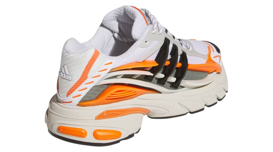 The shoe’s upper combines muted off-white and grey textiles with bright orange and beige TPU overlays that ripple across the sidewalls like tentacles in motion. Black 3-Stripes anchor the look, peeking through on both lateral and medial sides for a grounded adidas identity. Sturdy reinforcements at the eyestays and toe cap give the exaggerated shape a stable foundation, ensuring that this statement sneaker is more than just aesthetic flair.
