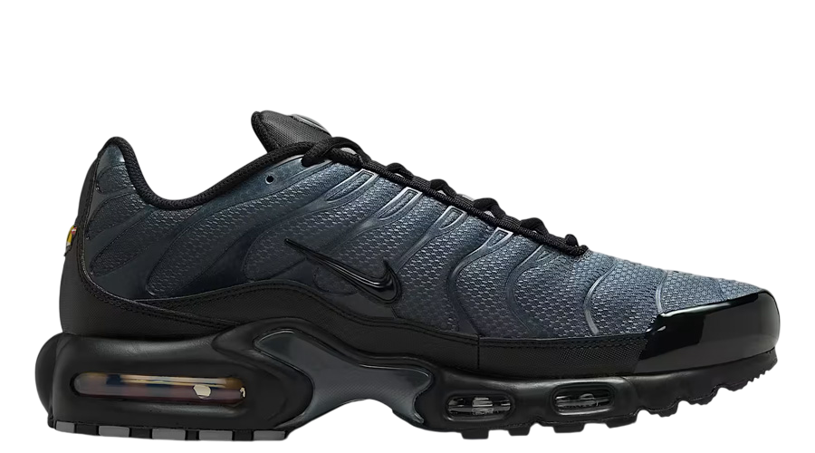 The PSG x Nike Air Max Plus “Black” strips back the colour and turns up the edge. Known for bold reds and navy pairings in previous Paris Saint-Germain collabs, this 2025 version leans into a darker, colder mood — dressed almost entirely in Black, Particle Grey, and Anthracite.