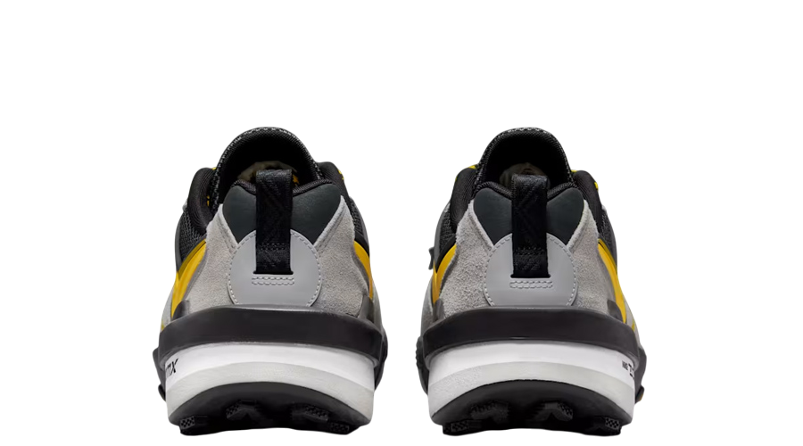 The upper pairs grey suede with black mesh and synthetic overlays, shifting textures in quick succession across the foot. Double Swooshes sit proudly on the sidewalls, one in shimmering silver, the other in bright yellow, stacking layers for that unmistakable Sacai signature. The toggle lacing system pops with contrast, splitting light and dark tones to underline the utilitarian feel. Co-branded tongue tags and sockliners add small but punchy details, locking in the collaboration’s identity.