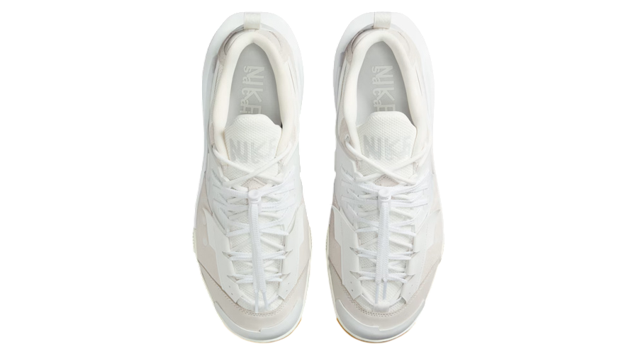 The upper comes layered in sail and white tones, mixing suede, leather, and synthetic materials for a dynamic finish. Flapping overlays sit across the forefoot, while a sturdy midfoot cage reinforces the silhouette’s structure. A double Swoosh stacks on each side, blending subtly into the light palette, while co-branded sacai and Nike tags land on the tongue and sockliner. Mesh around the collar keeps airflow in check, ensuring the shoe stays breathable even during extended wear.