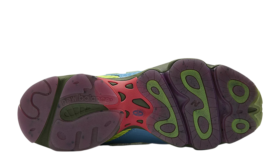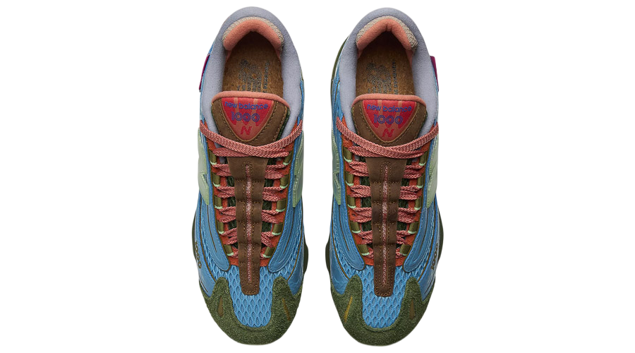 The upper features a patchwork of materials—spacer mesh vamps, leather overlays, and hairy suede tips—each panel arriving in its own shade. Blue nods to the mountain ridges, while coral pink captures the glow of sunset. Pops of lavender, orange, red, and yellow energise the design, with deep green grounding the look through mudguards and midsoles. Even the left and right shoes carry slightly different colour placements, adding a sense of individuality to every pair.