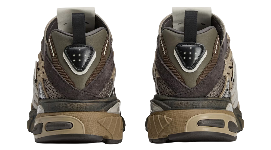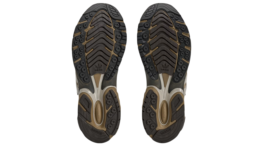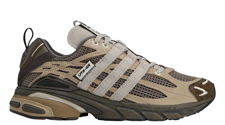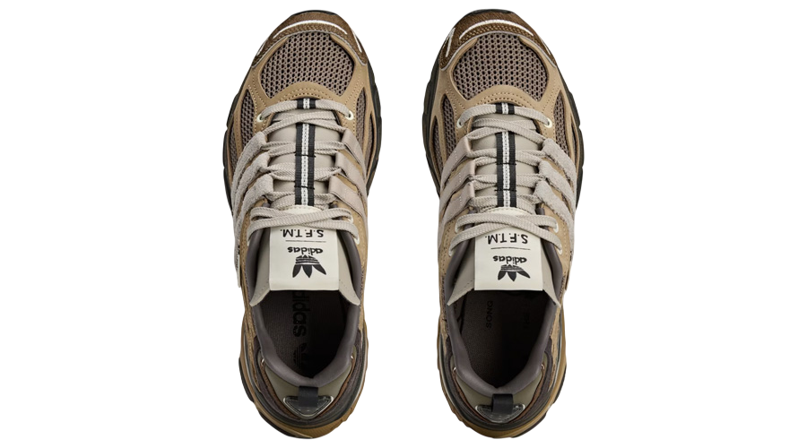 Branding details include co-branded Trefoil and SFTM labels on the tongue and sockliner, marking another high-profile collaboration between adidas and the Australian label. The chunky midsole features adiPRENE+ in the forefoot and adiPRENE in the heel, ensuring impact protection and long-lasting comfort. A distressed finish on the midsole adds a worn-in, vintage feel, while the rubber outsole delivers grip and durability.