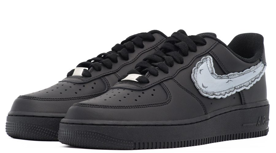 Featuring a striking design, this sneaker boasts a printed, die-cut Swoosh cloud appliqué that artfully overlays the original logos. This design element provides a contemporary take on the classic white and black Air Force 1s. The sneaker’s all-black colourway adds a sleek and versatile edge, making it a fashionable choice for various styles.