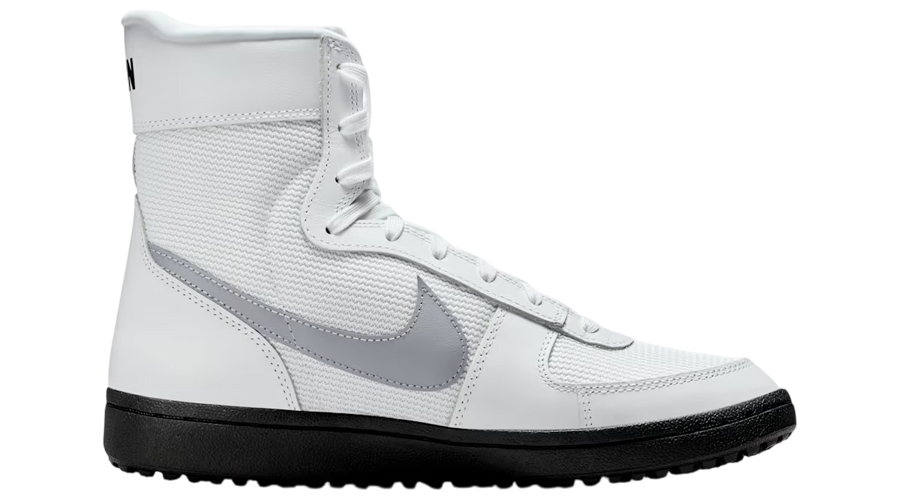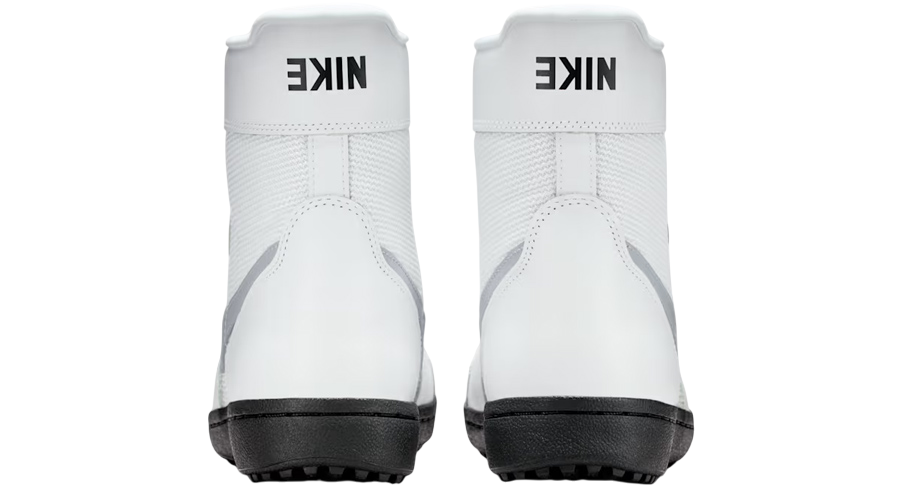 You get a crisp white leather base with a soft grey Swoosh cutting through the sidewalls. Simple. Sharp. Easy to pair with anything. The raised heel tab and padded collar add steady support, while the high cut gives the shoe that familiar Eighties stance. The fit feels secure thanks to standard laces and a cushioned sockliner that softens each step.