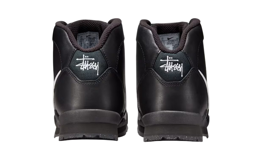 The upper blends full-grain leather with durable textile panels, striking a balance between breathability and protection. A textured Swoosh cuts through each side, sitting beside co-branded labels on the tongue and insole. Stüssy keeps things raw and functional — no gloss, no gimmicks, just substance.