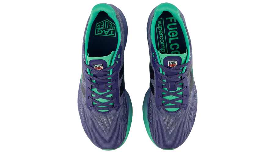 The upper is crafted from a deep blue and purple FantomFit mesh that delivers lightweight structure and breathability. Across the sides, the signature “N” logo fades from neon green into black, adding a sense of motion even when you’re standing still. A five-sided TAG Heuer crest sits proudly on the tongue, with co-branded details on the sockliner and heel confirming the partnership. Every visual cue feels fast, from the aerodynamic curves to the electric colour contrast inspired by TAG Heuer’s “Dream State” concept.