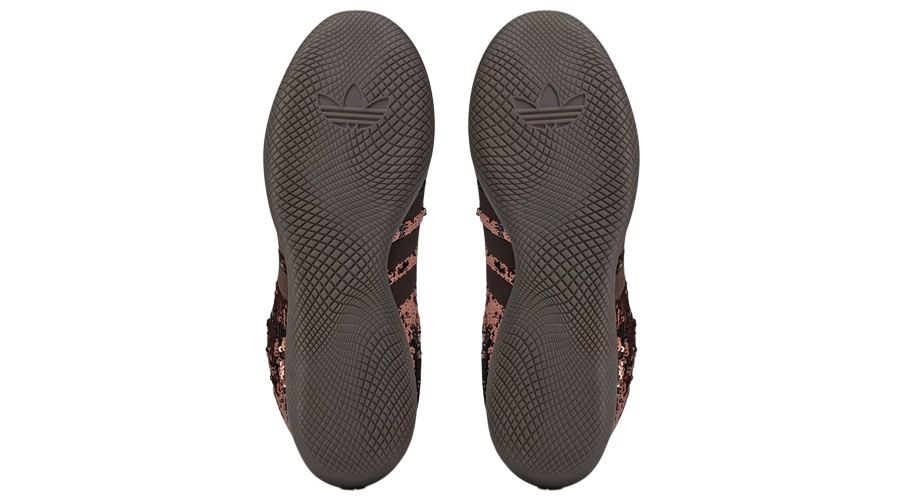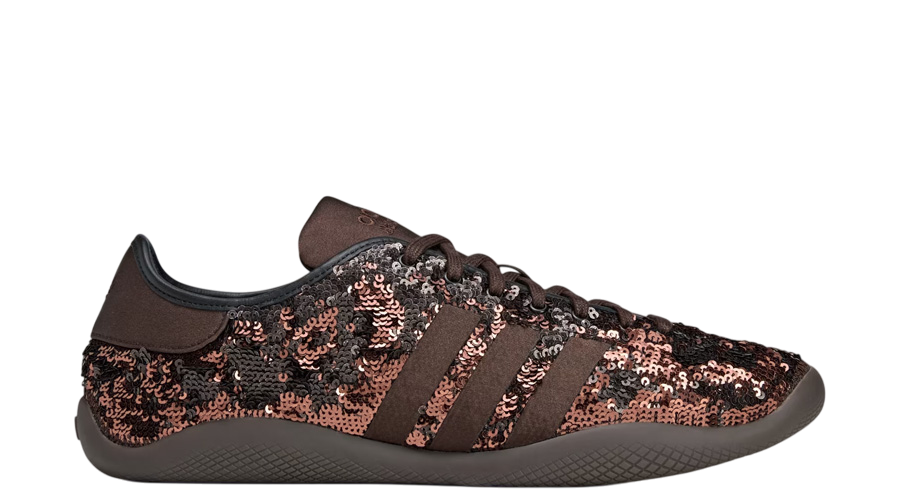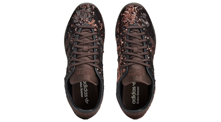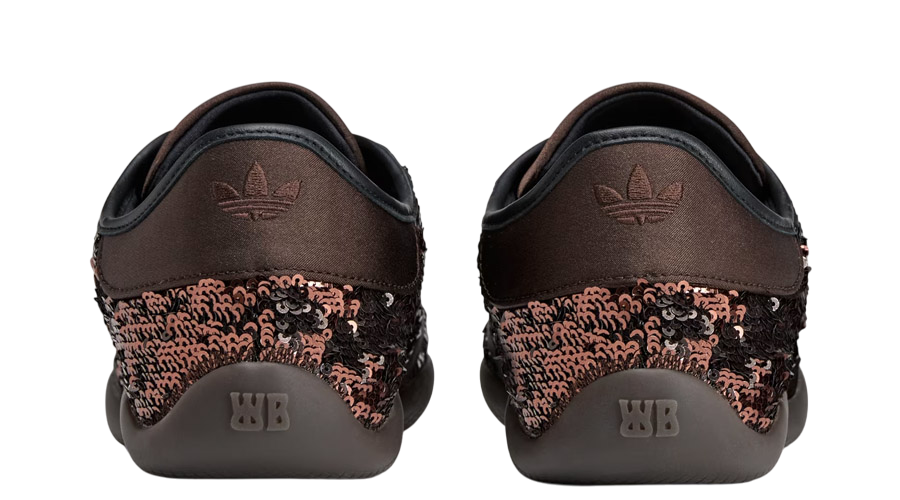 The upper is covered in rich brown sequins that catch the light from every angle, shifting tones as you move. Satin 3-Stripes sit quietly along the sides, keeping the balance between flash and finesse. The co-branded tongue and sockliner mark the long-running partnership between Wales Bonner and adidas, while the classic Trefoil sits neatly on the heel tab, tying the design back to adidas’ roots.