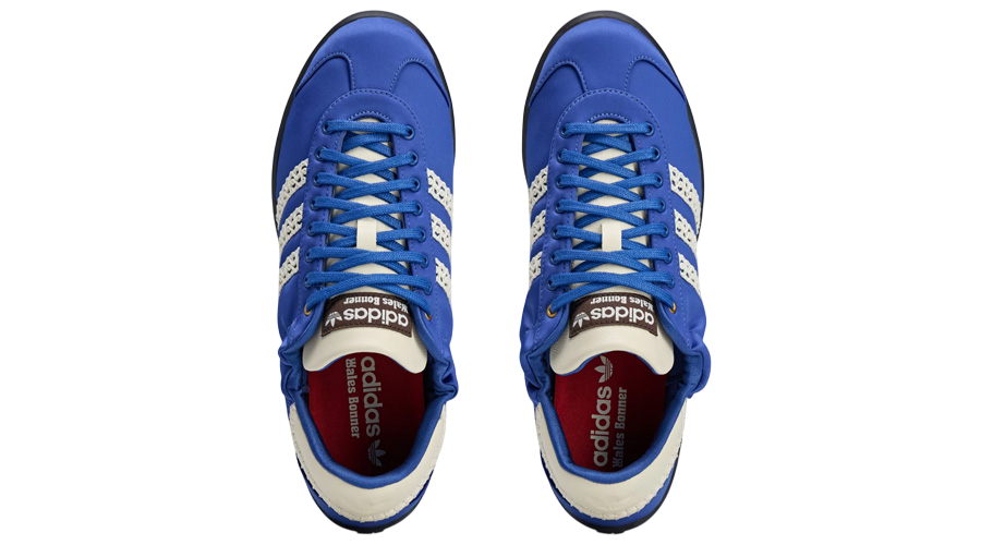 White 3-Stripes pop against the blue backdrop, detailed with subtle stitched patterns that nod to Wales Bonner’s distinct craftsmanship. The protective T-toe overlay and oversized heel stitching add texture and depth, keeping the silhouette interesting from every angle. Branding stays understated — a small “Wales Bonner” mark on the side, co-branded tongue and insole, and a soft leather heel tab stamped with the Trefoil logo.