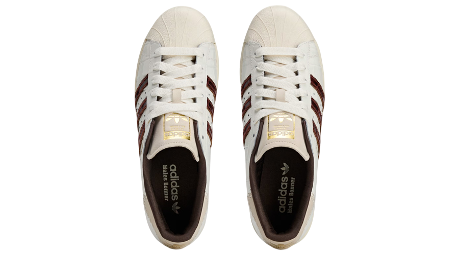 A soft nubuck tongue and heel moustache round out the upper, bringing in a smooth touch against the embossed panels. Polished gold aglets and alternating branding details — Wales Bonner in gold foil on one shoe, adidas Superstar on the other — seal the collaboration with a quiet confidence. It’s a small detail, but it says a lot about the thought behind the design.