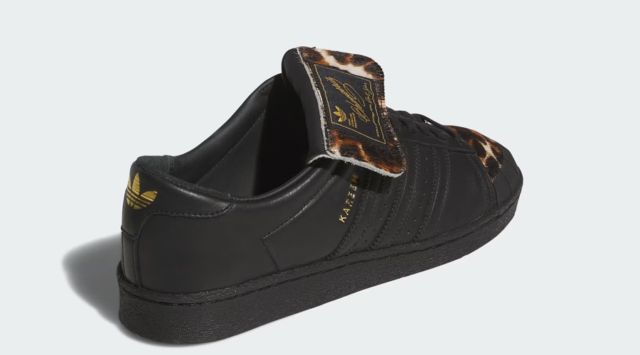 Gold accents break through the blackout base. You get “KAREEM” stamped on the right shoe and “WILLY” on the left. Both shine just enough to catch the light. The heel carries a gold trefoil print that ties the look together.