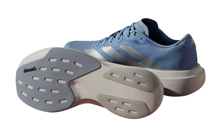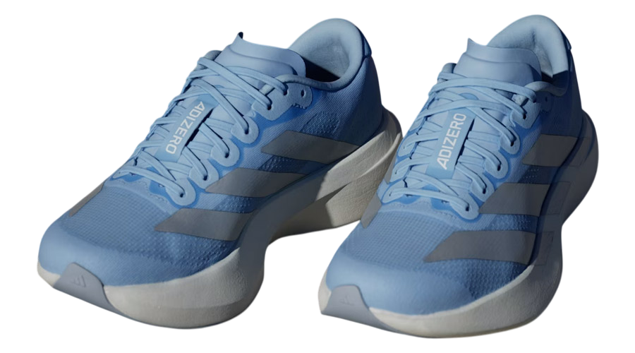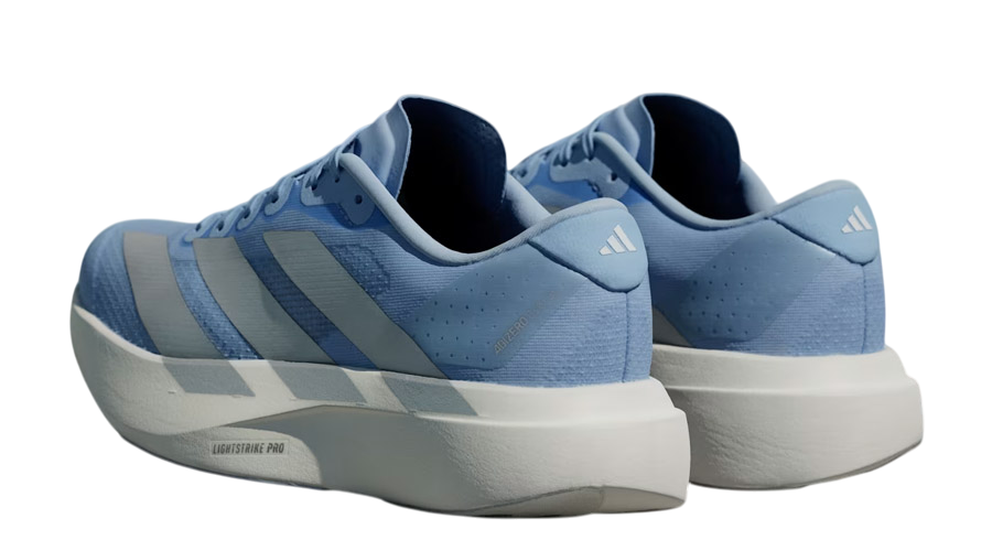 The upper arrives in breathable textile and lightweight synthetic layers dressed in a fresh glow blue shade. Silver metallic 3-Stripes cut through the sides for a crisp finish, while subtle Adizero branding on the midfoot, sockliner, and foxing celebrates its place in the franchise. The design leans into a streamlined, racing-inspired look, giving the shoe a fast aesthetic even when standing still.