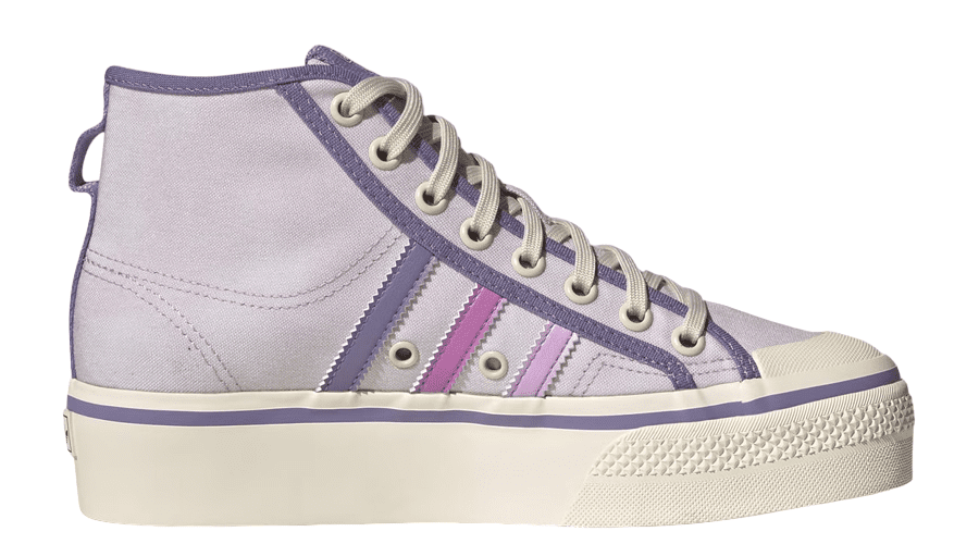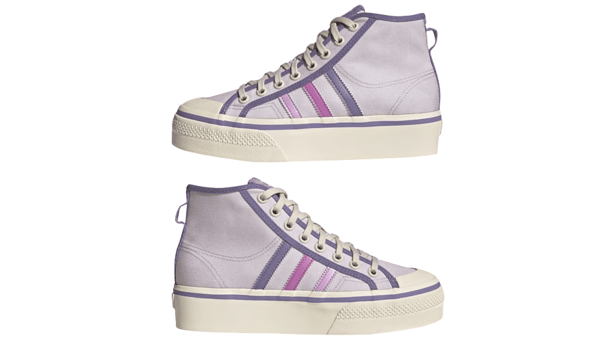 With a lace closure and a textile upper made from high-performance yarn, these sneakers feature a sturdy rubber toe bumper and textile lining for enhanced durability and comfort. The platform midsole and rubber outsole not only provide a stylish elevation but also establish a functional base. Notably, the upper’s yarn composition includes at least 50% Parley Ocean Plastic and 50% recycled polyester, showcasing a dedicated commitment to sustainability. Presented in a captivating colour combination of Almost Pink, Pulse Lilac, and Wonder White, the GX4608 WMNS Nizza Platform Mid “Almost Pink Pulse Lilac” perfectly encapsulates the fusion of fashion, environmental consciousness, and enduring appeal.