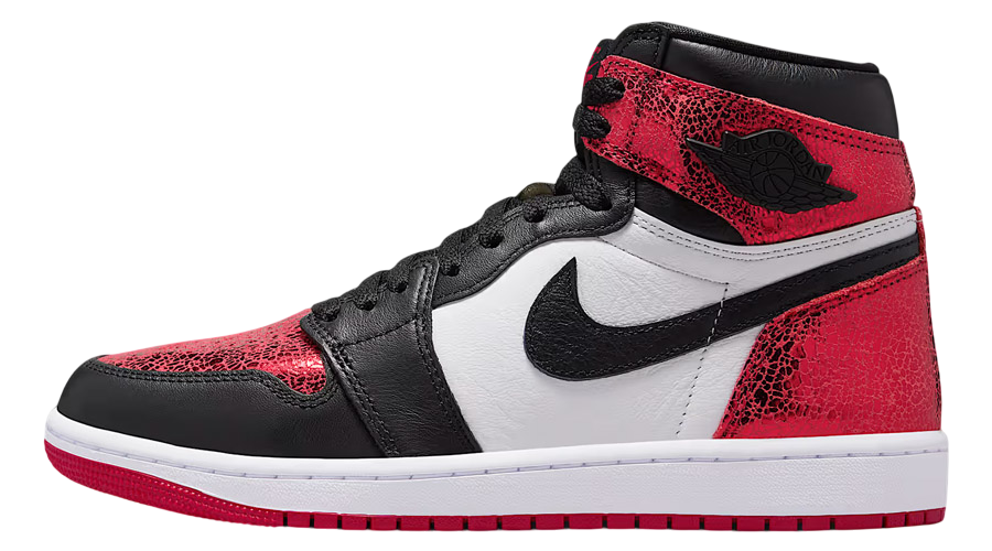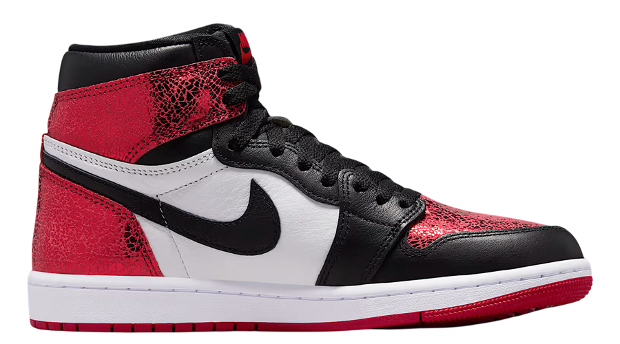 A cracked leather texture takes over the Varsity Red sections, giving the toe box, heel, and collar a raw, worn-in character. It’s a finish that adds depth without straying far from the original DNA. The white leather mid panels keep things crisp, while black overlays and Swoosh branding bring contrast and structure. Altogether, the look nods to heritage while introducing just enough edge to feel fresh.