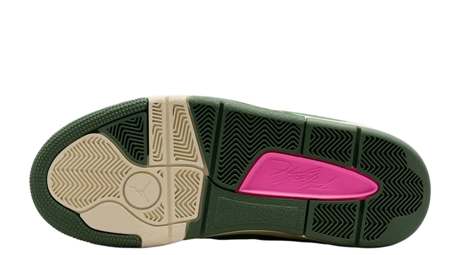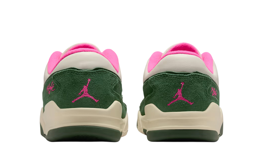 A deep fir green base sets the tone. Smooth leather and rich suede create texture and depth, giving the shoe a premium look without feeling overdone. Then comes the punch — bright Pink Blast accents hitting just the right spots to break through the darker tones. The contrast is sharp, loud, and unapologetic. Whether you’re rocking these with black cargos or cropped denim, they demand attention.