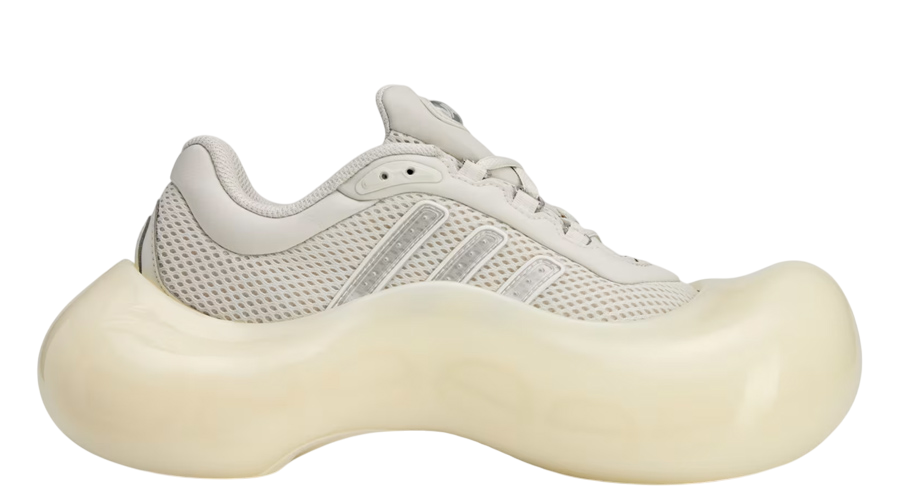 Beneath the bubble-shaped outsole, adidas Bounce units are still visible, showing that comfort hasn’t been sacrificed for design. The upper contrasts the wild sole with an off-white mesh build, offering breathability and softness. Metallic silver 3-Stripes provide subtle structure, while plush padding at the collar and eyestay keeps the fit secure.