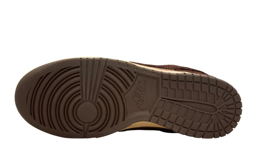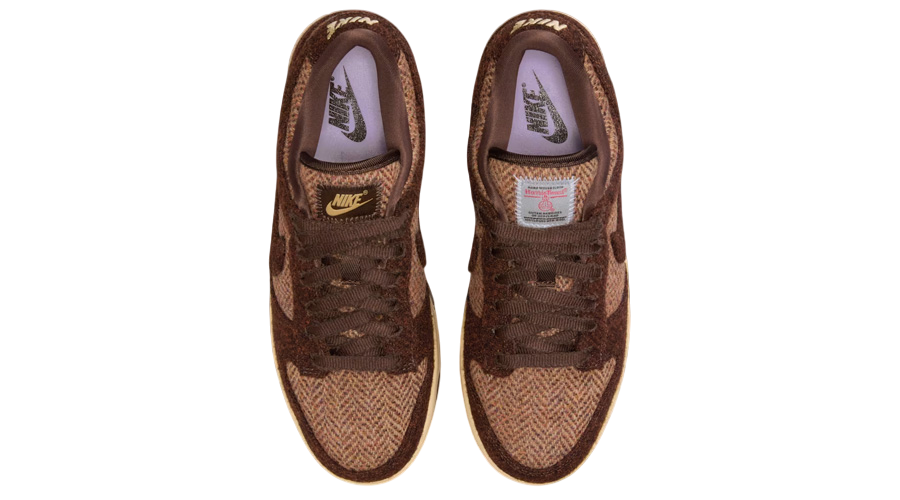 A soft beige base sets the stage for rich Baroque Brown overlays, producing a warm two-tone palette that feels both classic and versatile. The iconic Swoosh sweeps across the sidewalls in a matching brown shade, tying the look together with understated confidence. On the tongue, a co-branded Nike and Harris Tweed label makes the partnership clear, while traditional Nike logos on the heel tab and sockliner reinforce the Dunk’s basketball lineage.