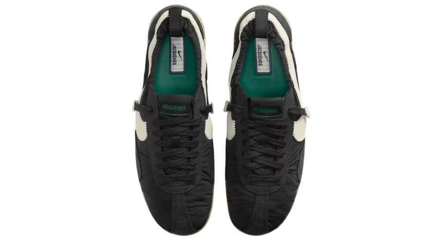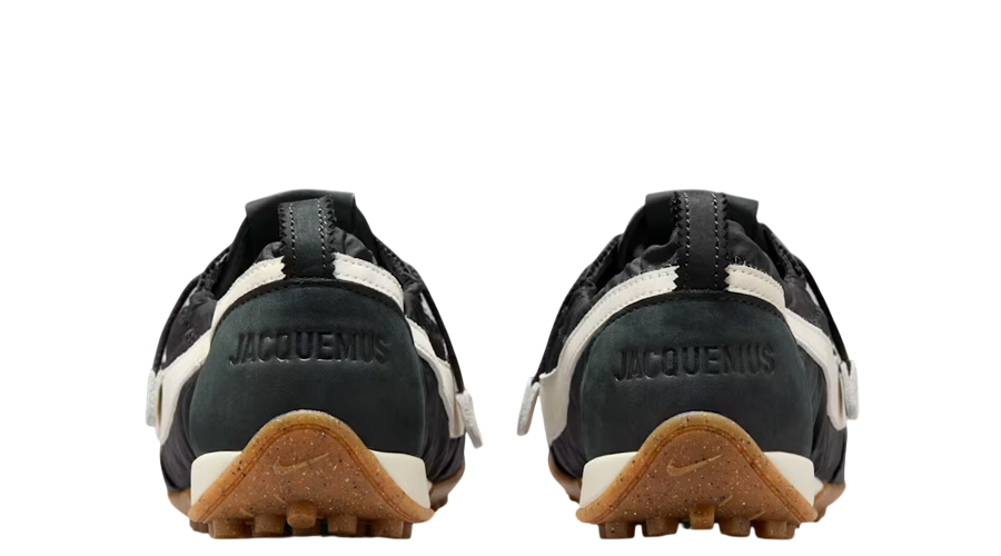 The upper features a mix of black nylon with suede overlays across the toe, eyestay, and lateral forefoot. This layered construction stays true to the runner’s vintage design, but Jacquemus adds a signature twist with scrunched collars and a serrated heel pull tab, creating a deconstructed yet functional finish. An oversized off-white Swoosh sweeps across the sidewalls, sitting neatly alongside co-branded touches on the tongue and sockliner.