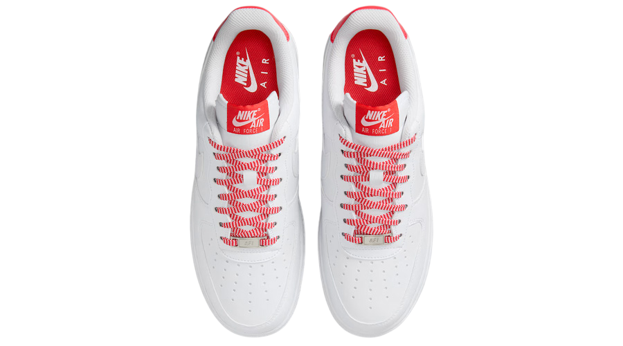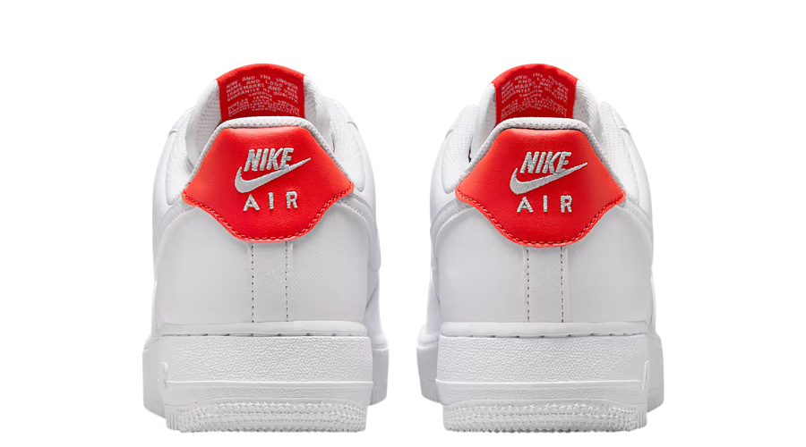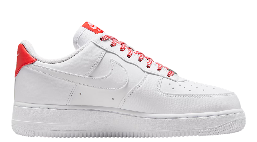 Patterned red-and-white laces set the tone, introducing a bold contrast against the neutral base. It’s a small tweak, but one that shifts the entire mood of the shoe. The heel tab follows suit with a red leather finish, breaking from the all-white formula that’s made the AF1 a staple since the ’80s. Elsewhere, the toe box, eyelets, and heel overlays feature a ballistic-style texture that adds subtle variation to the all-leather build.