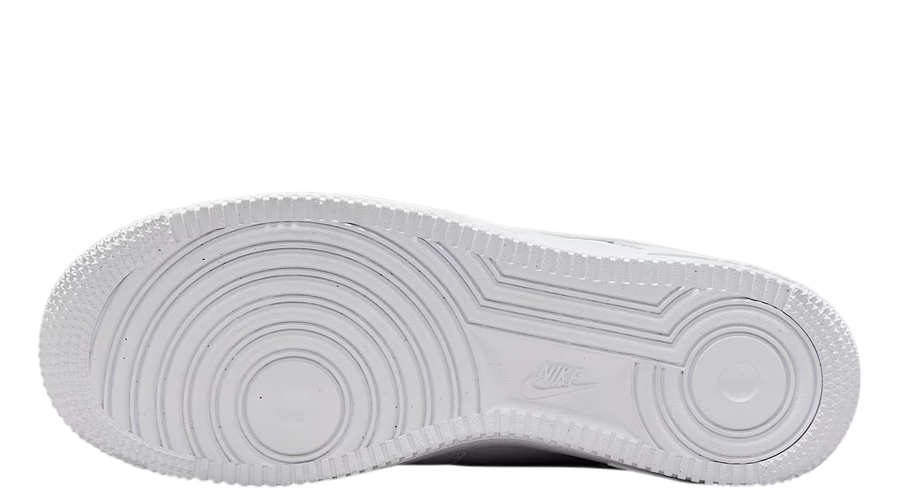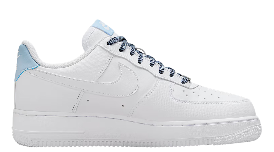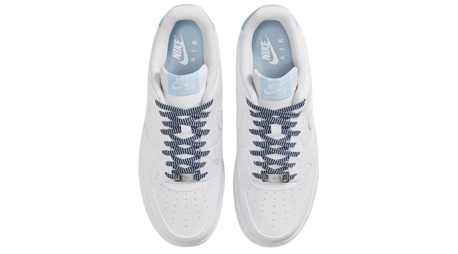 The most eye-catching feature? The laces. Navy and white stripes run in a jagged pattern across the full length, bringing instant movement and contrast against the clean leather upper. Nike didn’t overcomplicate the rest — white dominates across the toe box, overlays, and sole unit, staying loyal to the AF1’s clean reputation. But look closer and you’ll find some unexpected material tweaks.