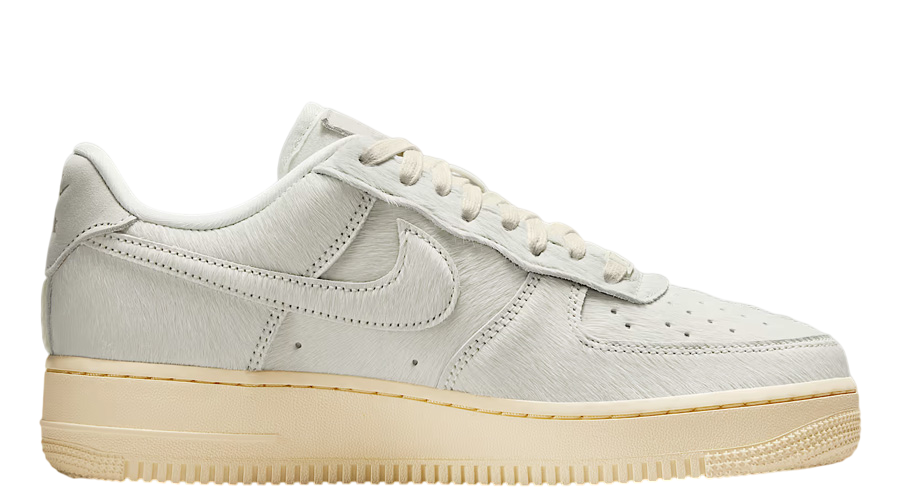 The WMNS Nike Air Force 1 Low “Pony Hair” reimagines the classic with a textured twist. Hair-on leather dominates the upper, delivering a depth and tactility rarely seen on this silhouette. The off-white tone works in harmony with the material, giving the shoe a refined look without losing its streetwear credibility. Every panel catches the light differently, adding movement to what would otherwise be a muted colour palette.