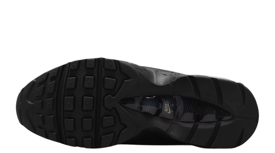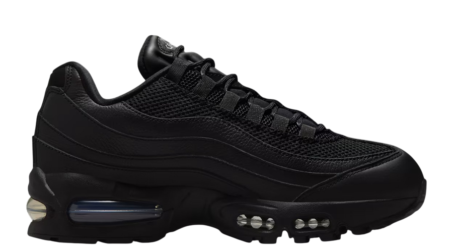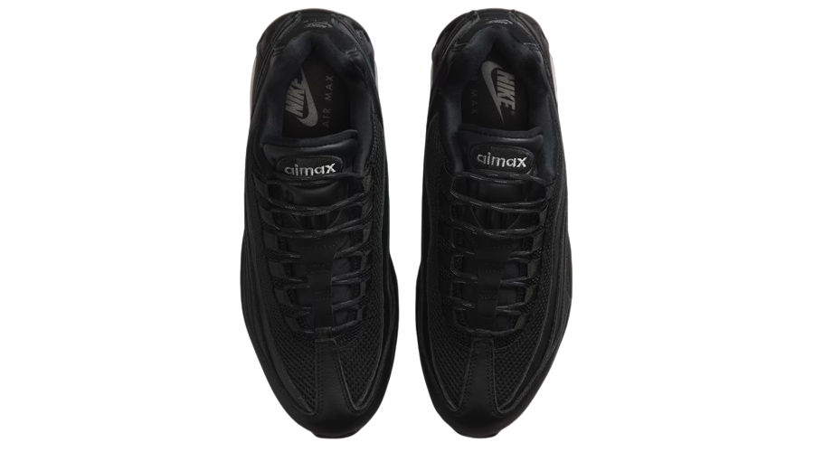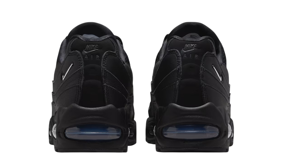 Every part stays blackout — mesh, lace loops, tongue, everything. Then Nike plants a jewel Swoosh on the heel, small but deliberate, catching light like a hidden badge of honour. To anyone who lives and breathes 95s (or 110s for the UK faithful), that one detail signals collectability.