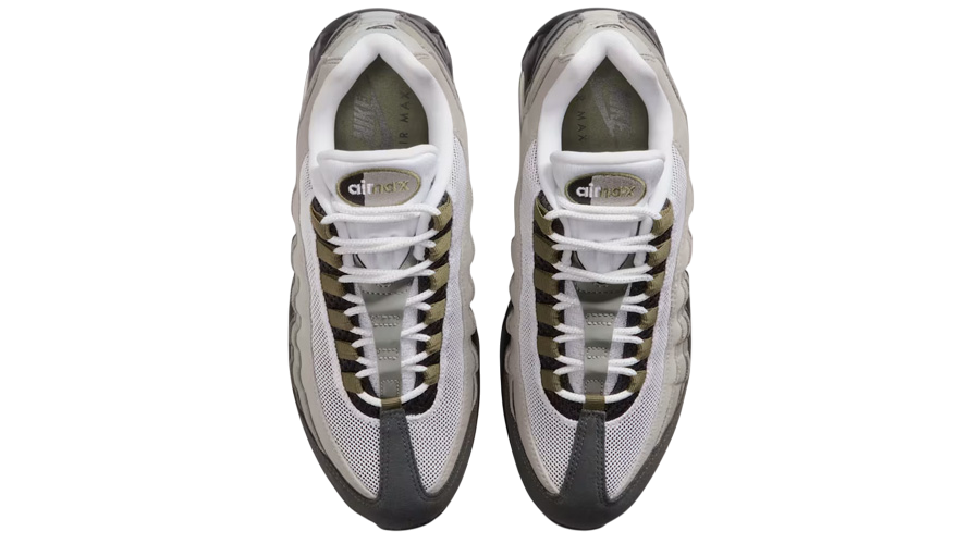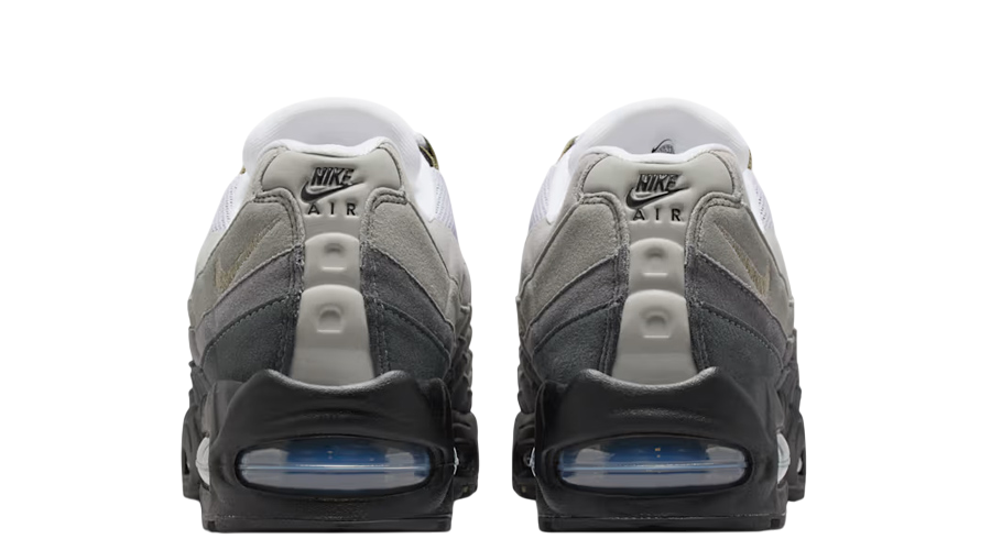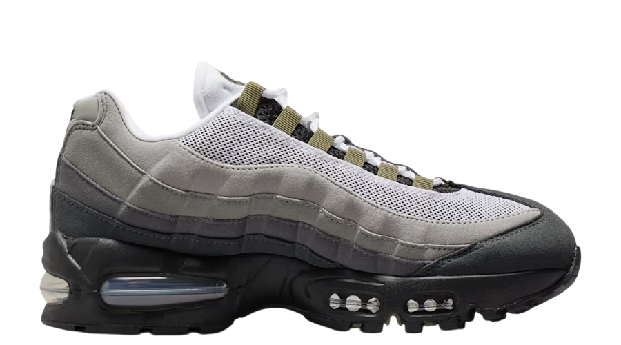 This pair keeps the signature wavy layers that made the 95 a classic, inspired by the human body’s muscle structure. The upper runs through a smooth greyscale gradient, fading from light to dark with precision. Olive hits wrap around the nylon eyelets and embroidered Swoosh, adding depth and texture. You’ll also spot matching details on the tongue pill logo, rear, and insole — subtle but sharp.