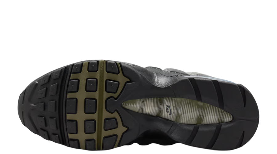 Underfoot, it’s all about comfort and cushioning. A black polyurethane midsole surrounds the Big Bubble Air unit in the heel, backed by the standard Max Air in the forefoot. Together, they deliver that signature bounce and shock absorption that’s kept the 95 relevant for nearly three decades. The waffle rubber outsole ensures reliable grip, while the TPU shank plate offers added stability on every step.