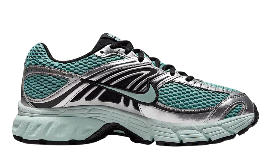 The upper combines airy mesh in a vibrant green shade with metallic silver synthetic overlays that wrap across the midfoot and heel. Retro Nike branding sits on the tongue, side panel, and back tab, while a subtle ‘Y2K’ logo on the sockliner reinforces the early-2000s vibe. Despite the throwback aesthetic, it still feels current thanks to clean colour blocking and layered detailing.