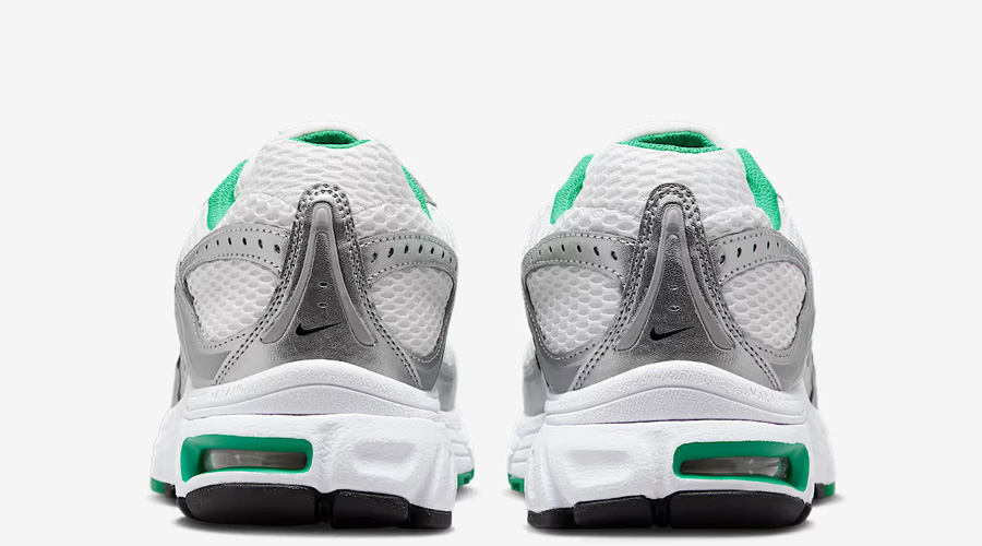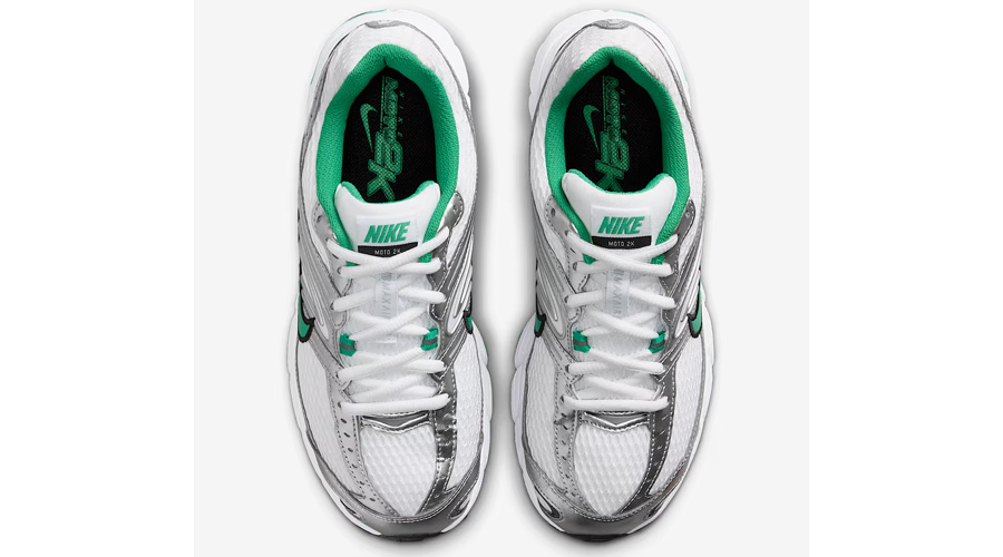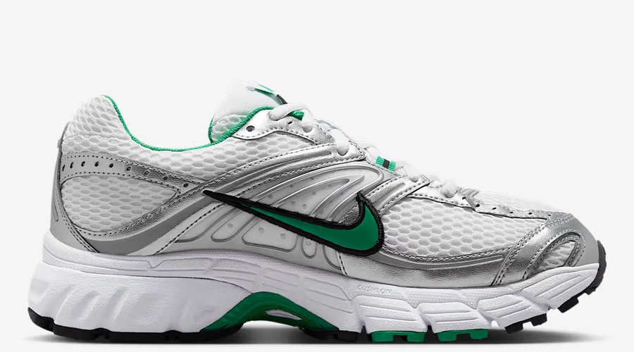 The “White Stadium Green” colourway balances clean design with bold accents. A breathable white mesh base lays the foundation, while metallic overlays run across the upper in true Y2K fashion. Pops of Stadium Green hit the Swoosh, lace loops, and heel details, breaking through the neutrals with sharp contrast. Curved panel lines across the sides mirror the era’s distinctive design language, keeping the retro DNA intact.