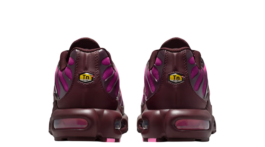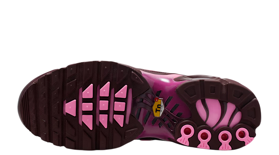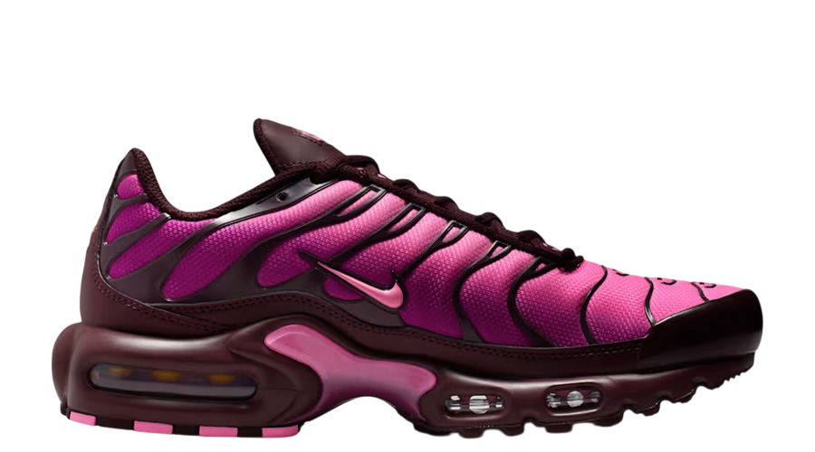 The upper features a striking purple-to-pink fade across breathable mesh, creating a dynamic look that catches the light with every step. Overlaid with the model’s signature wavy cage in a dark lava-inspired Burgundy Crush, the design feels powerful yet refined. The Cactus Flower and Pink Spell accents tie the look together, while the iconic yellow TN badge at the heel adds that unmistakable finishing touch for long-time fans of the Air Max Plus line.