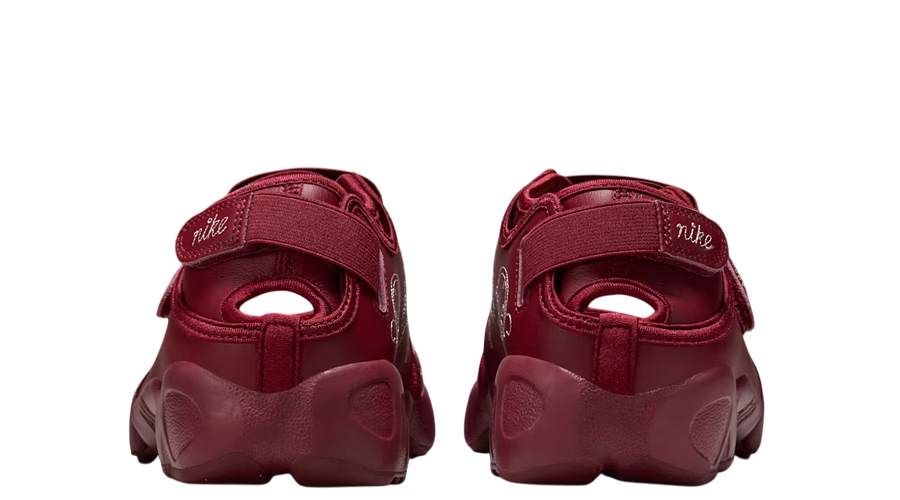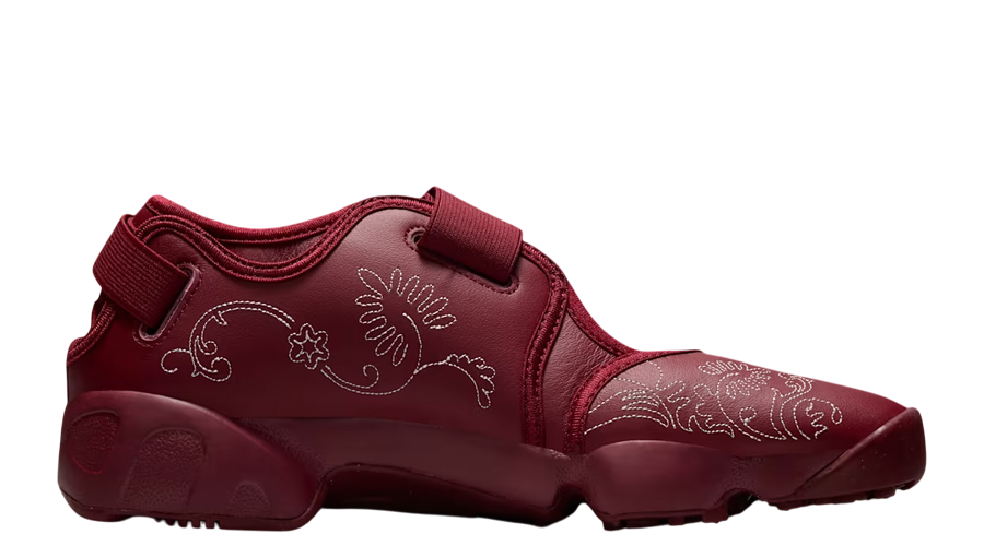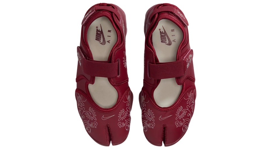 The Nike Air Rift returns in a fresh women’s-exclusive edition, blending sporty DNA with floral embroidery for a softer finish. Rich Team Red leather makes up the upper, with clean white stitching forming delicate floral patterns across the toebox, medial panels and strap. This embroidery adds a hand-crafted look, contrasting the sleek base while staying true to the shoe’s bold split-toe identity.