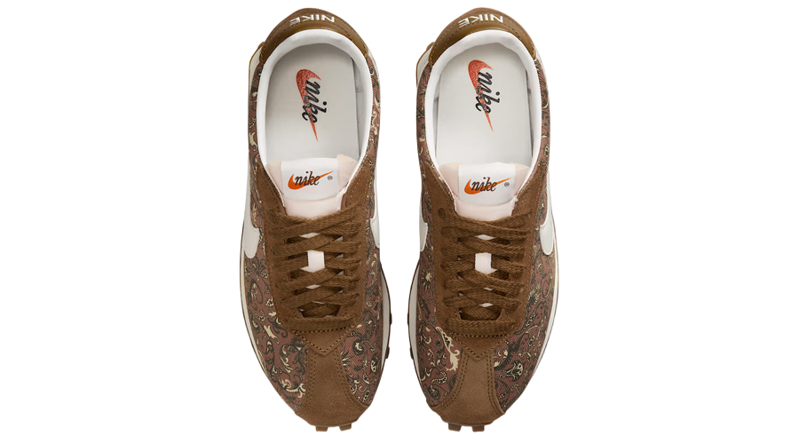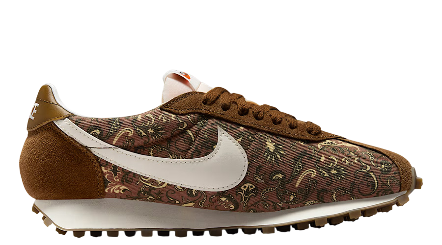 Instead of the usual mesh base, Nike opts for sturdy canvas dressed in an intricate bandana print. The pattern weaves through warm shades of brown, black and red, wrapping the upper in a layered visual feel that leans handcrafted. Rich brown suede covers the eyelets, toe wrap and heel for a more grounded finish, while the white Swoosh, tongue and lining offer some balance up top.