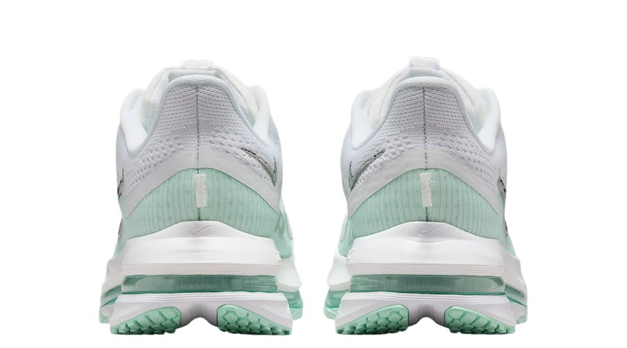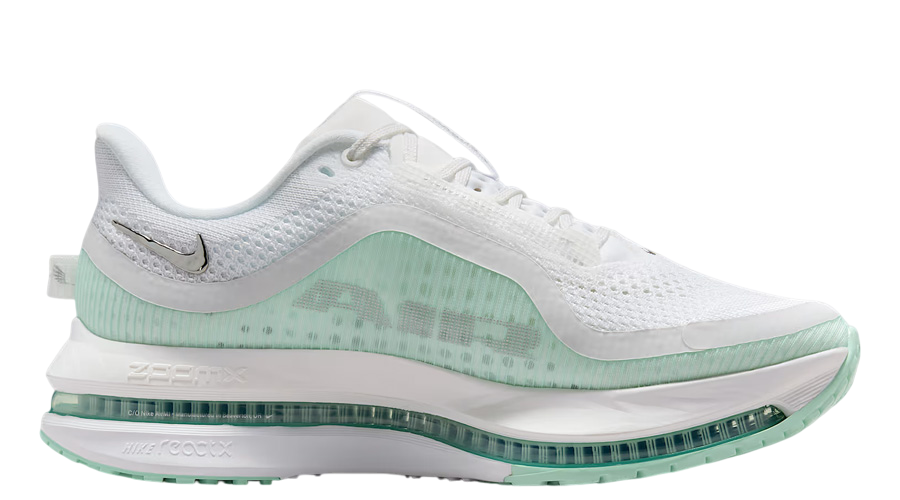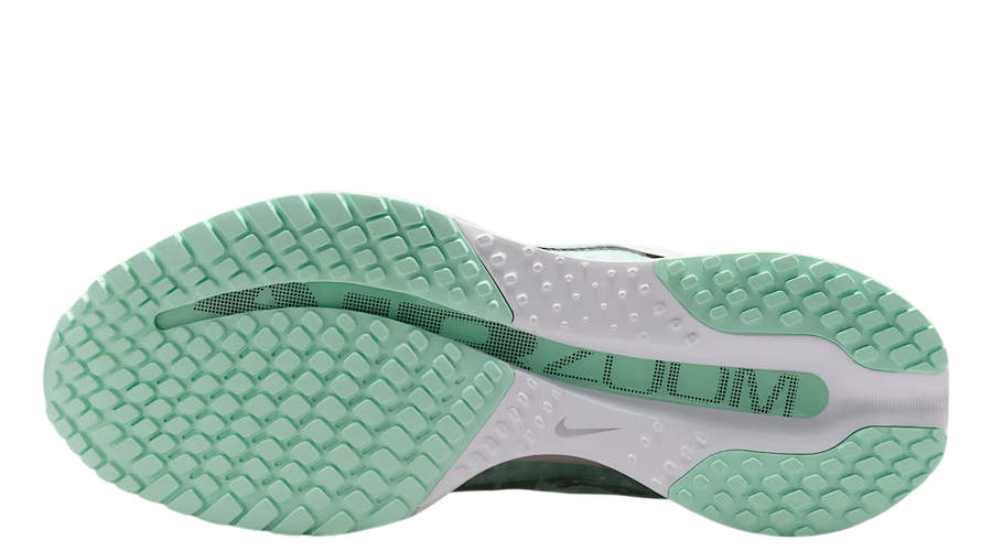 The upper feels light from the moment you lace it up. Nike uses a see-through mesh construction with a breathable base and minimal overlays, reducing pressure points and weight. That soft mint tone appears on the outsole and through the visible Zoom Air system, tying together performance and aesthetics without going over the top. A metallic silver Swoosh floats just above the midfoot, adding a subtle shine that completes the design.