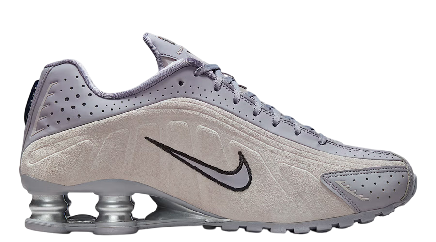 Nike brings back a classic from the early 2000s with the WMNS Nike Shox R4 “Cement Grey,” a release that fuses nostalgic design with subtle updates. The silhouette stays faithful to its roots, carrying the original aerodynamic lines and layered construction that defined the model. A mix of leather and mesh forms the base, while panels of suede on the sidewalls add a more premium edge. The Cement Grey palette flows across the upper, mirrored on the Swoosh and balanced with darker accents, creating a finish that feels both familiar and fresh.