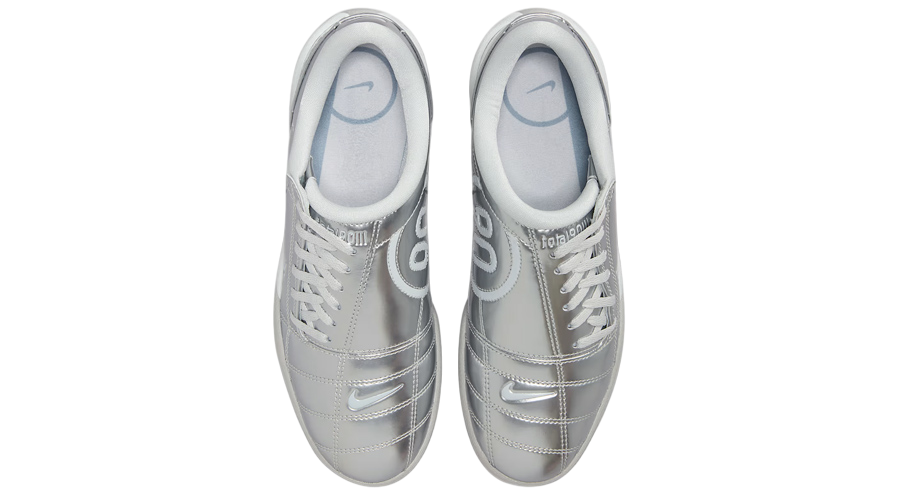 The upper? Pure early-2000s. That quilted finish is still front and centre, wrapped in shimmering metallic tones that bounce light from every angle. A clean white Swoosh cuts through the reflective upper, while pale blue branding on the insole adds a soft contrast to the otherwise chrome-heavy setup.