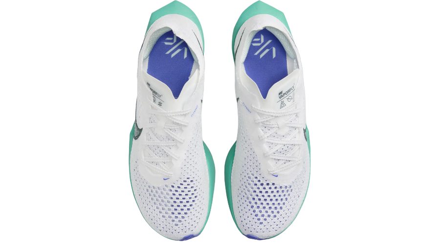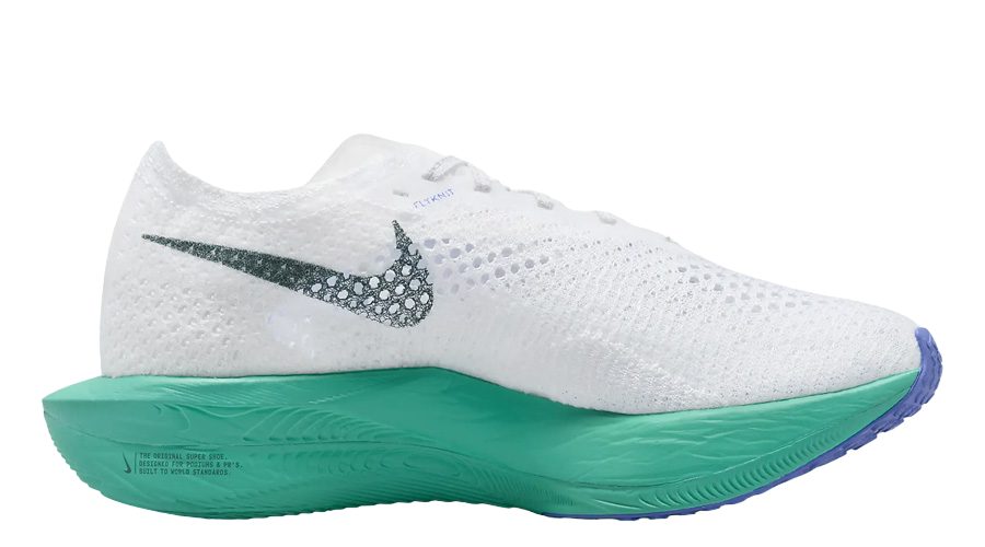 Additional updates in the VaporFly 3 include a slimmer rubber outsole which retains durability while reducing overall weight. This allows for extra ZoomX foam, enhancing cushioning and improving stride transition. Comfort enhancements include light padding on the tongue to reduce lace pressure and an offset heel seam to minimise heel friction. The new Waffle outsole pattern, featuring perforations, provides reliable traction across various surfaces and weather conditions. Designed with a wider toe area for a more spacious fit, the shoe also includes an internal foam pod at the heel for added cushioning. Presented in a striking White/Jade Ice/Clear Jade/Deep Jungle colour scheme, the VaporFly 3 is as visually striking as it is performance-oriented.