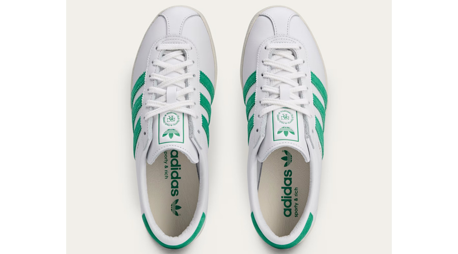 Sporty & Rich dresses the upper in crisp white leather, letting the clean lines do the talking. Subtle hits of “Court Green” appear on the heel tab and branding, delivering contrast without overloading the look. A curved collar softens the profile, while the slim shape keeps it low-key and versatile.