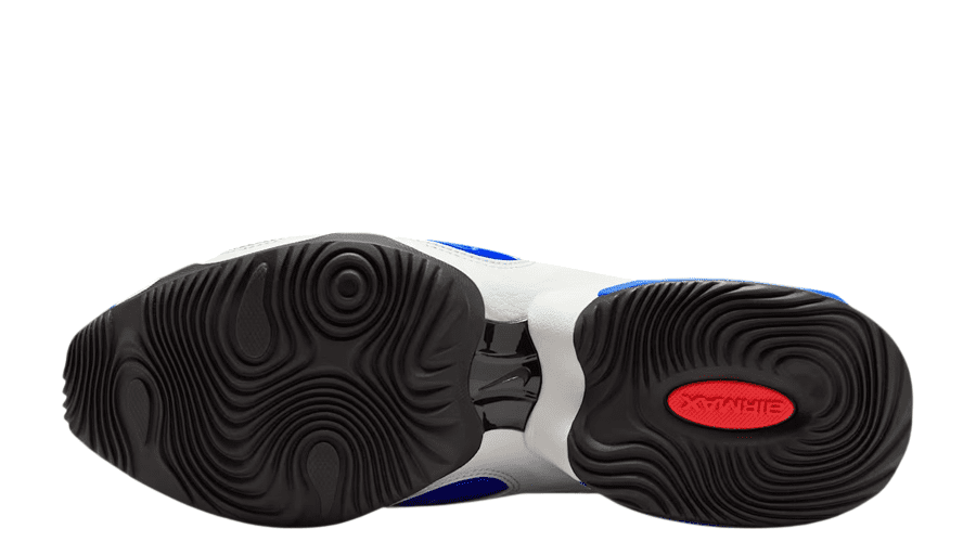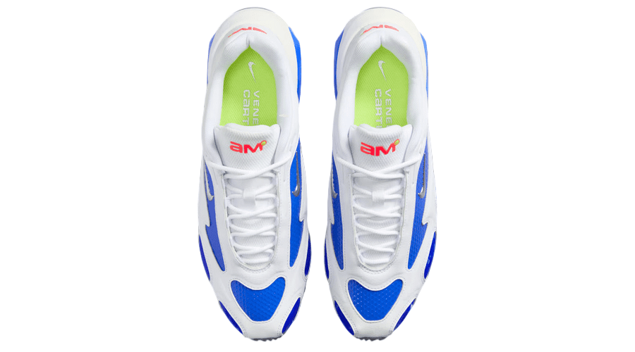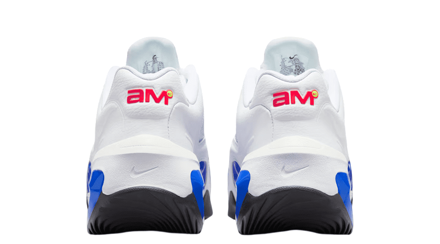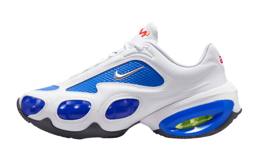 The upper starts with a crisp white leather base. Clean and simple at first glance. Then the colour kicks in. Racer Blue mesh panels add depth across the shoe, giving the design a sporty edge that feels straight out of classic basketball trainers.