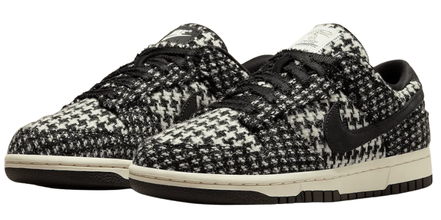 This edition features a bold black-and-white houndstooth upper that immediately stands out, with black leather hits across the Swoosh, eyestays, and heel adding structure and depth. A woven Harris Tweed label sits proudly on the tongue, nodding to its premium roots. Underfoot, the sail-coloured midsole softens the contrast while the black rubber outsole keeps it grounded.