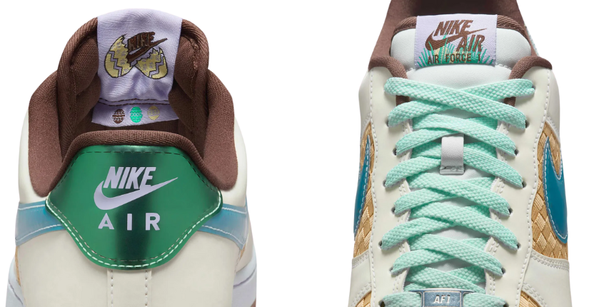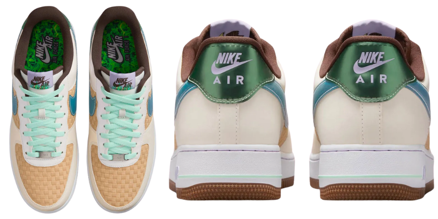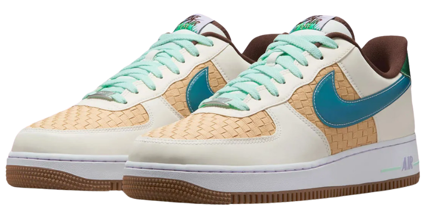 The first thing that you’ll notice about this Air Force 1 is its light brown woven base. This is then overlaid by crisp white leather panels that wrap around the ankle and toebox. “Metallic Green” Swooshes glide across the lateral and medial sidewalls, while minty accents hit the cotton laces.