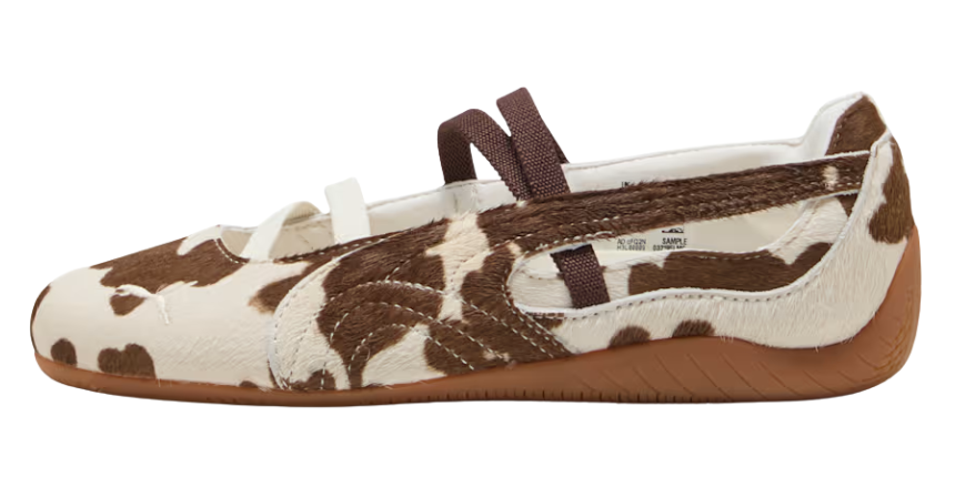 A racing icon reimagined as a ballet flat, but make it cowhide. Sleek and low-profile, with the cow print upper giving it a bold edge, blending racing heritage with everyday wearability.