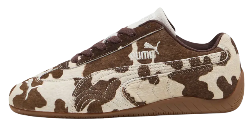 The Speedcat returns only this time, in cowhide! Cream and brown faux fur wraps the entire upper, flipping a motorsport classic into a cow print themed lifestyle sneaker.