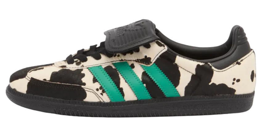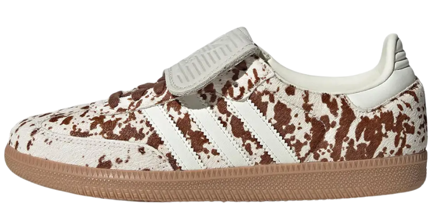 Same energy, warmer palette. Brown-and-cream cow fur dominates the upper, balanced by crisp white stripes and gum soles. It nods to past Samba collabs but Cow-Print takes center stage this time.